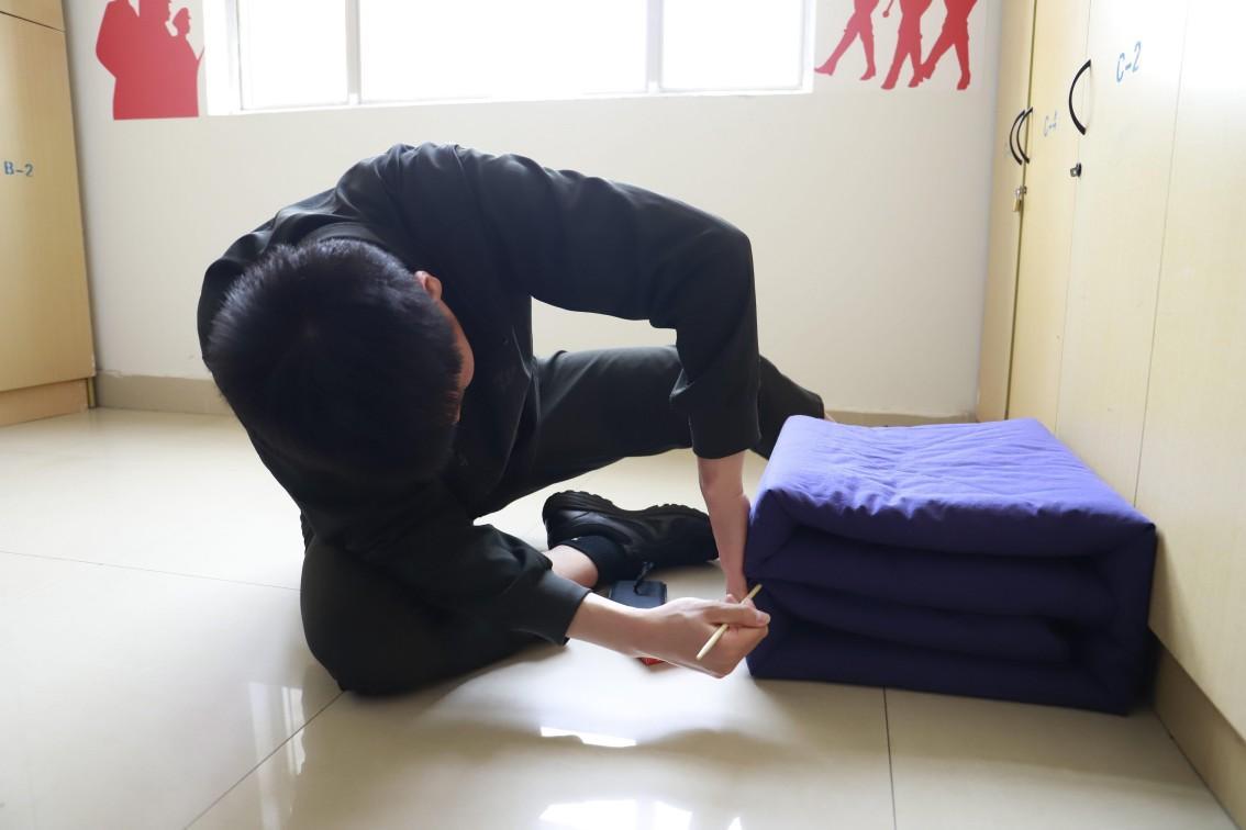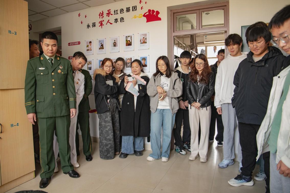 在学院生活管理部的统筹安排下,20余名学生骨干有序前往退役士兵宿舍参观学习。当宿舍门被推开的那一刻,标准化的内务环境令人眼前一亮:床铺之上,棱角分明的 “豆腐块” 军被摆放整齐;书桌表面,学习用品分类有序;地面光洁如新,毫无杂物堆积;宿舍墙壁上还有全体舍员的介绍。这些细节,无不彰显着军营生活严谨细致的优良作风。退役士兵王磊现场进行军被折叠技巧演示,他动作娴熟,边操作边讲解,让同学们直观、清晰地掌握了内务整理的技能要点。
