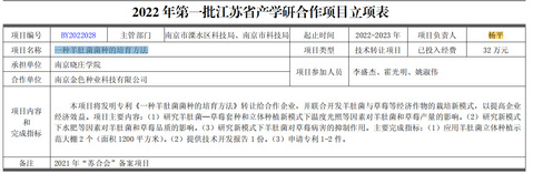 根据江苏省科学技术厅下发的《关于2022年第一批江苏省产学研合作项目立项的通知》(苏科区发〔2022〕101号),我院杨平老师获批立项一项项目:《一种羊肚菌菌种的培育方法》。