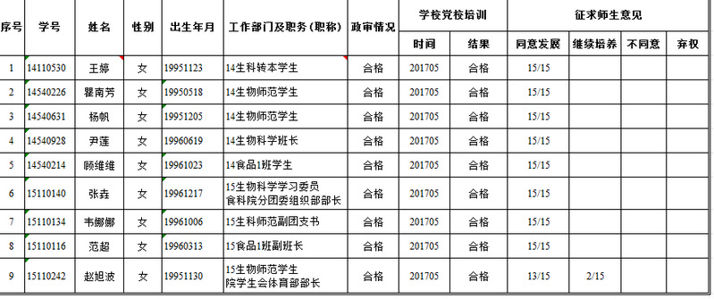 经学院学生党支部培养考察、政审、征求党内外群众意见和校党委组织部对党员发展材料的预审,新葡萄8883官网AMG党总支同意拟于近期讨论接收王婷等9位同志为中共预备党员,现将王婷等9位同志的基本情况公示如下,敬请党员、群众监督。