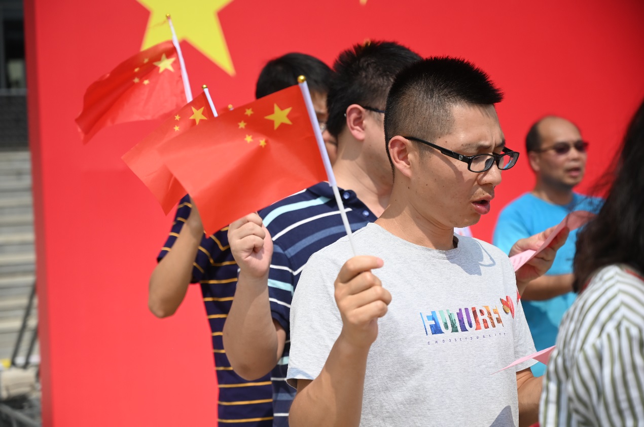 老师们头顶烈日,排成心形,与国旗同框,手摇国旗,胸前或脸上贴着国旗,共同唱响《我和我的祖国》,用歌声向祖国表白,用真心为新中国庆生,用实际行动为祖国献礼。