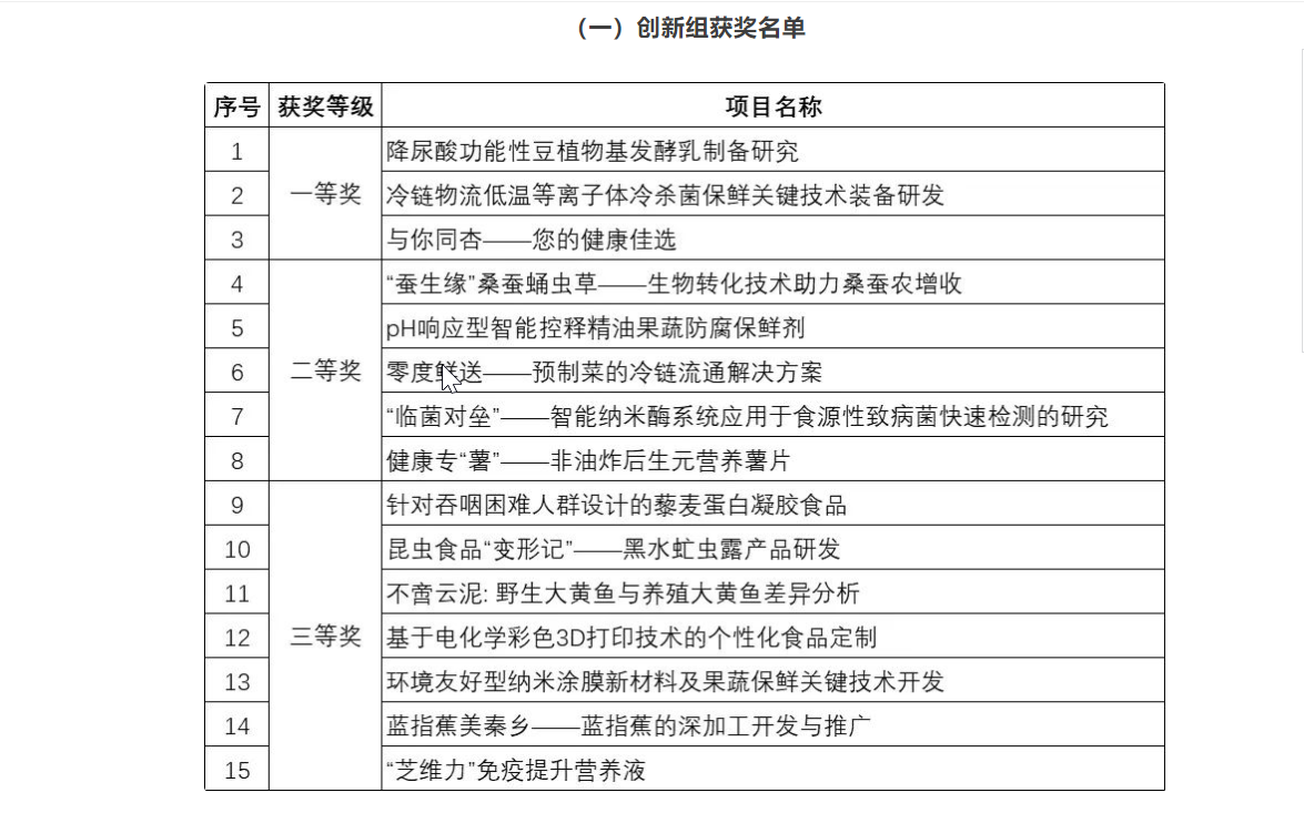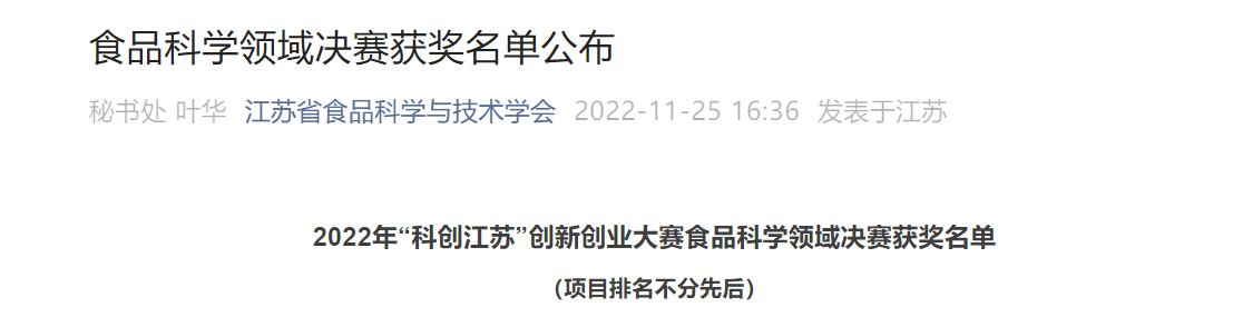 图2 2022年“科创江苏”创新创业大赛食品科学领域决赛获奖名单