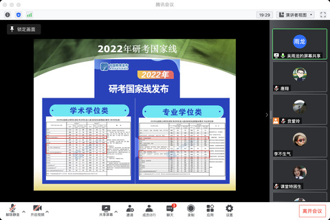 吴雨龙副书记首先根据研考国家线为大家分析今年的整体宏观趋势,其次从“复试构成、个人情况、衣着礼仪、复试常见问题”等几个方面对研究生复试进行了详细解读。随后从“考研分数区域的差异、调剂的具体操作程序、调剂注意事项、如何搜集调剂信息”等方面为大家进行调剂讲解,为考研同学们提供了明晰实用的指导,有效地帮助同学们解决了复试与调剂方面的疑惑。班主任老师们也纷纷为同学们加油打气、答疑解惑、出谋划策,表示将竭尽所能为同学们提供考试复试及调剂帮助。贲爱玲书记作总结讲话:1.祝贺大家初战告捷,希望大家再接再厉,在复试中也有出色发挥。2.希望大家脚踏实地,必要时把握调剂机会,提示考研二战不确定性。3.希望大家立足长远,以求得真学问为重。