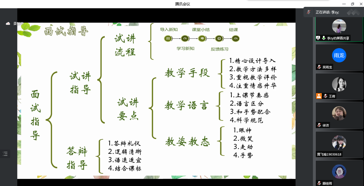 分享会上,刚从南京师范大学研究生毕业,又成功考取南京市第十三中学高中生物教师的倪佳佳校友就考研英语和政治,分享了自己的经验,她建议要保持英语语感,学会自己总结题型。政治的备考不用过早地开始,要结合题型来巩固知识点。而对考编,她介绍了自己用的考编参考书,同时又介绍了在考编笔试和面试中应该注意的问题,特别指出要提前熟悉高中生物教材和生物新课标,方能应付自如。而从浙江师范大学研究生毕业,又以笔试、面试第一的成绩上岸南京师范大学附属中学新城初中的李子音校友对专业课的复习提出了自己的建议:要形成自己的知识体系,不能死记硬背知识点,要有自己的思考;考研的道路是漫长而痛苦的,但只要下定决心,肯定会有所收获。对于考编面试,她则从试讲流程、试讲要点(教学手段、教学语言、教姿教态等)和答辩要点(答辩礼仪、答辩逻辑、答辩语速等)三个方面详细的讲解了面试全过程。