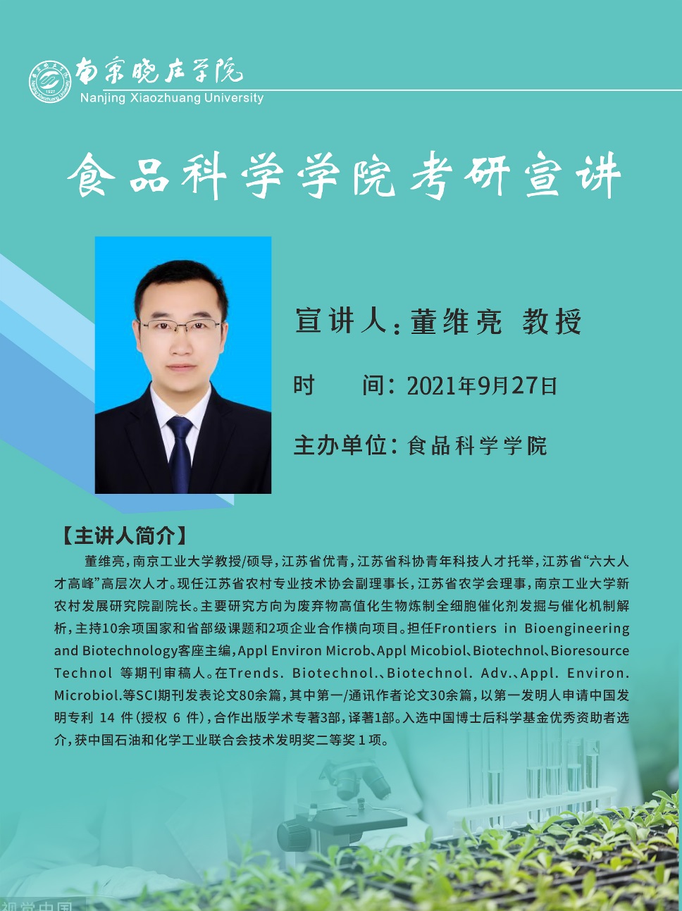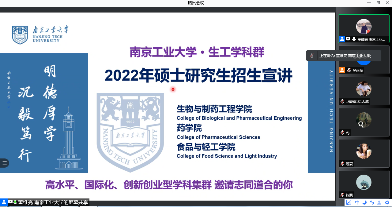 为激发学生考研积极性,帮助学生掌握相关考研技巧,了解更多考研专业资讯,我院考研协作高校,南京工业大学硕导、新农村发展研究院副院长董维亮教授,于9月27日线上为我院学生举办考研宣讲会,我院2018级全体学生和其他年级学生代表聆听了宣讲。活动由新葡萄8883官网AMG副书记吴雨龙主持。