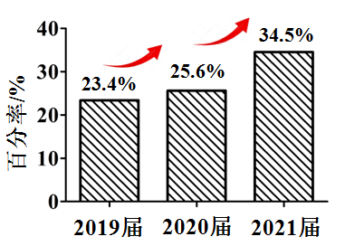 2019年至2021年,学院考研录取率呈逐年上升趋势,分别为23.4%、25.6%、34.5%。这是学院坚持实行的“本科生全程导师制”和“考研指导金牌班主任制”的结果。通过导师和班主任全程四年的悉心指导,提供课程复习、指导院校选择、指导考研复试、指导考研调剂;学院领导班子的高度重视,设立考研教室、慰问考研学子、开展考研动员大会、举行考研经验交流会等等,保证了学生的考研积极性逐步提高。