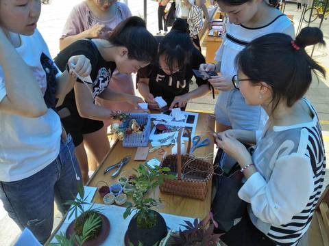 赏花识草社团编制了一个个精致的花篮和精美的书签,现场与同学们分享他们的制作心得,教授同学们如何编制花篮和识别花草,普及植物小常识。