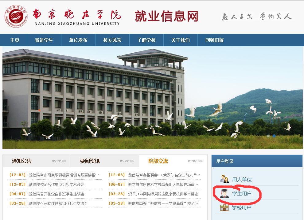 1、登录南京晓庄学院就业网(http://njxzc.91job.org.cn/),点击“学生用户”输入学号和密码(初始密码为学号后6位,若忘记密码可找李老师修改)